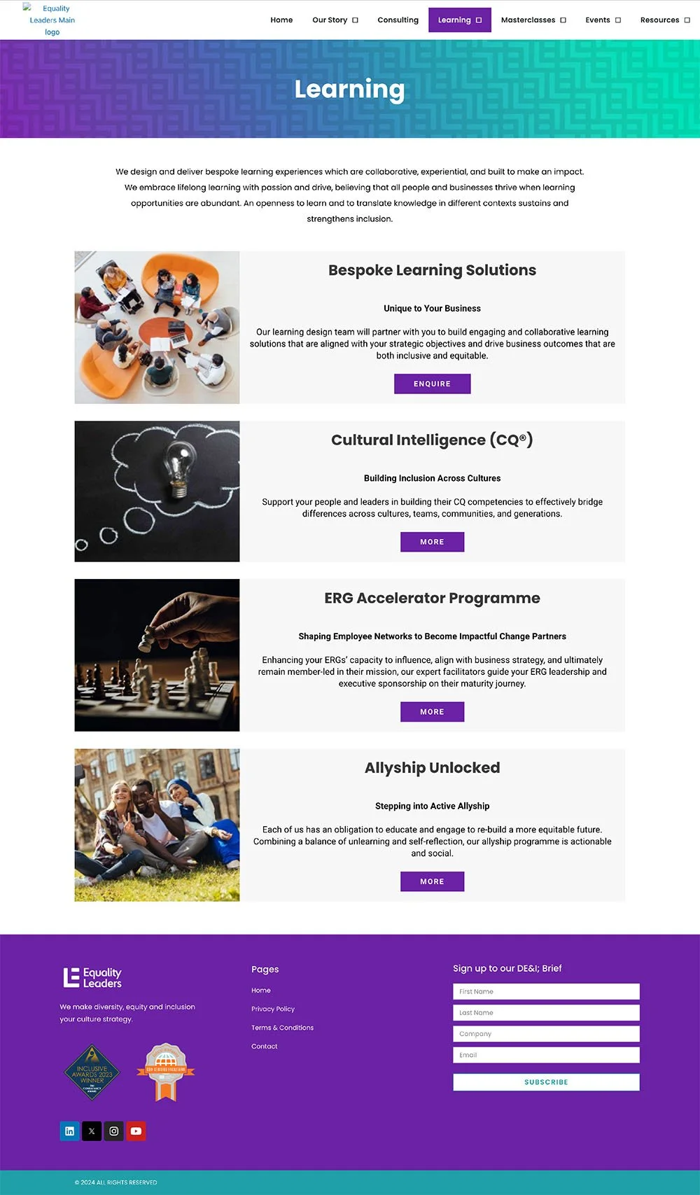 Equality Leaders is an award-winning business that transforms how organisations approach diversity, equity and inclusion learning. Trusted by top global brands and a bold vision to make learning the everyday culture, their team wanted a website that better reflected their expertise, values, and evolving role in shaping inclusive futures.